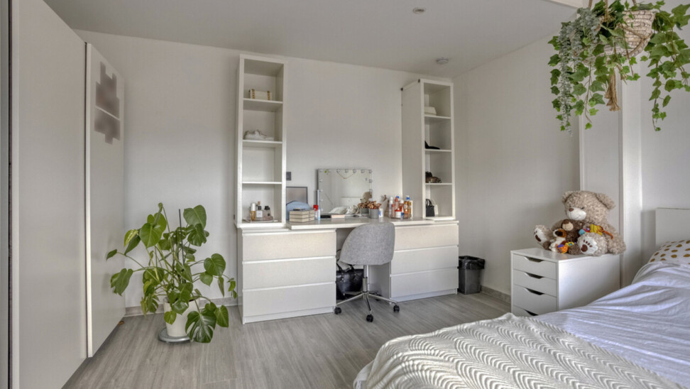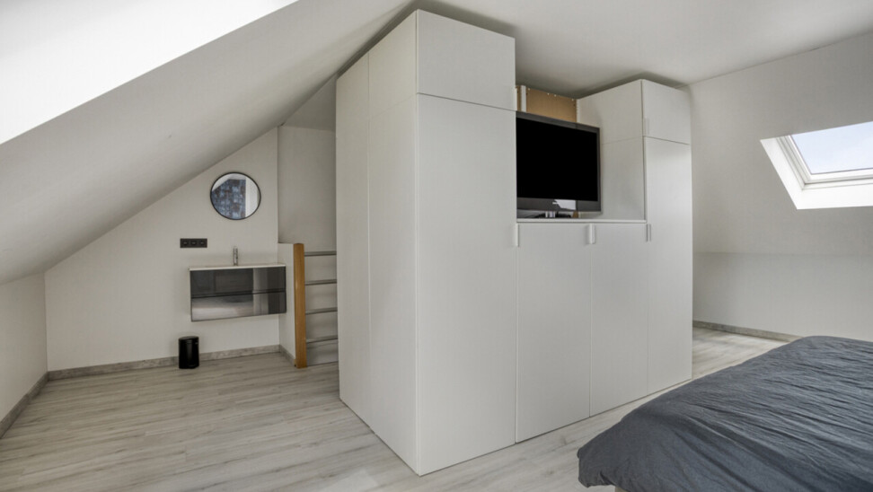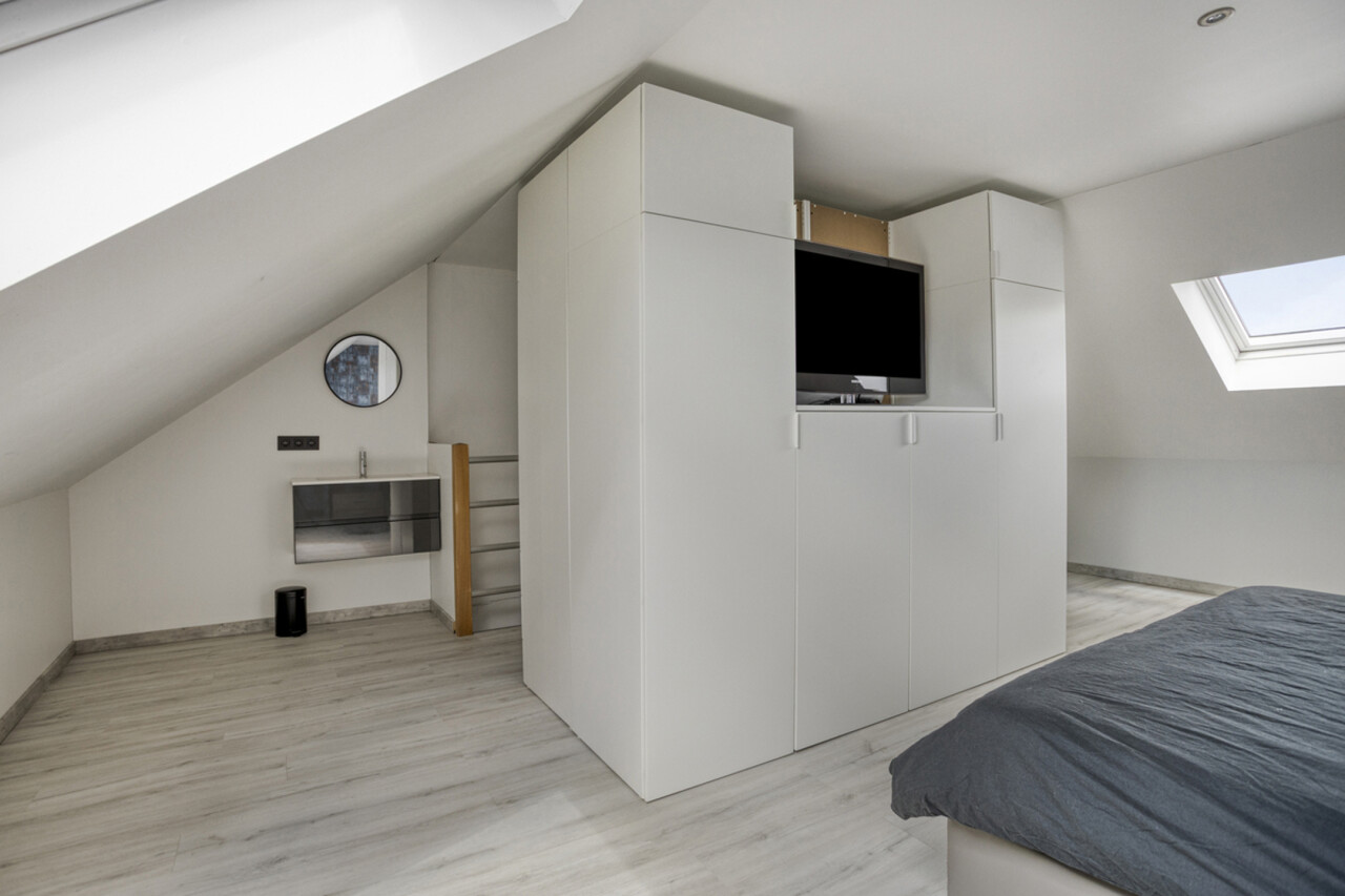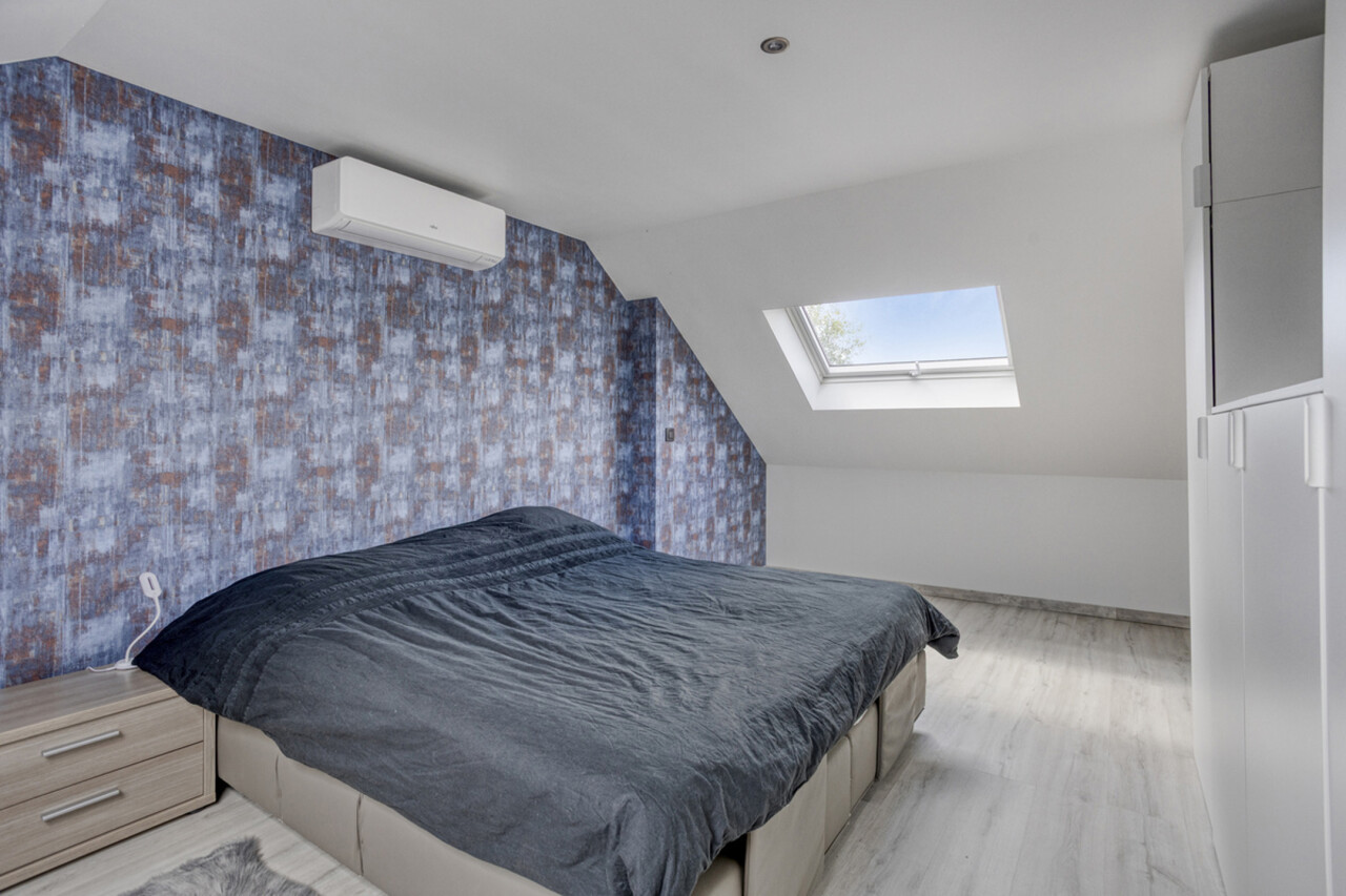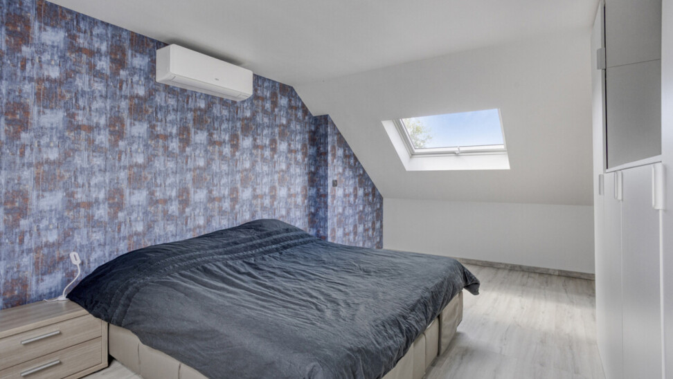 De zolderverdieping werd ingericht tot een grote slaapkamer met dressing en lavabo. De kamer werd voorzien van airco.