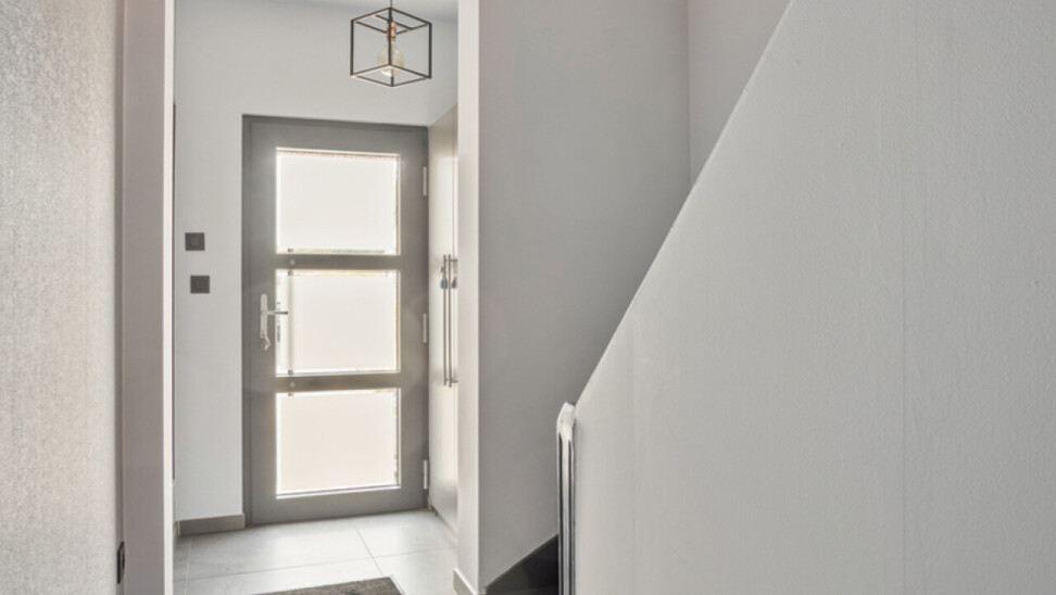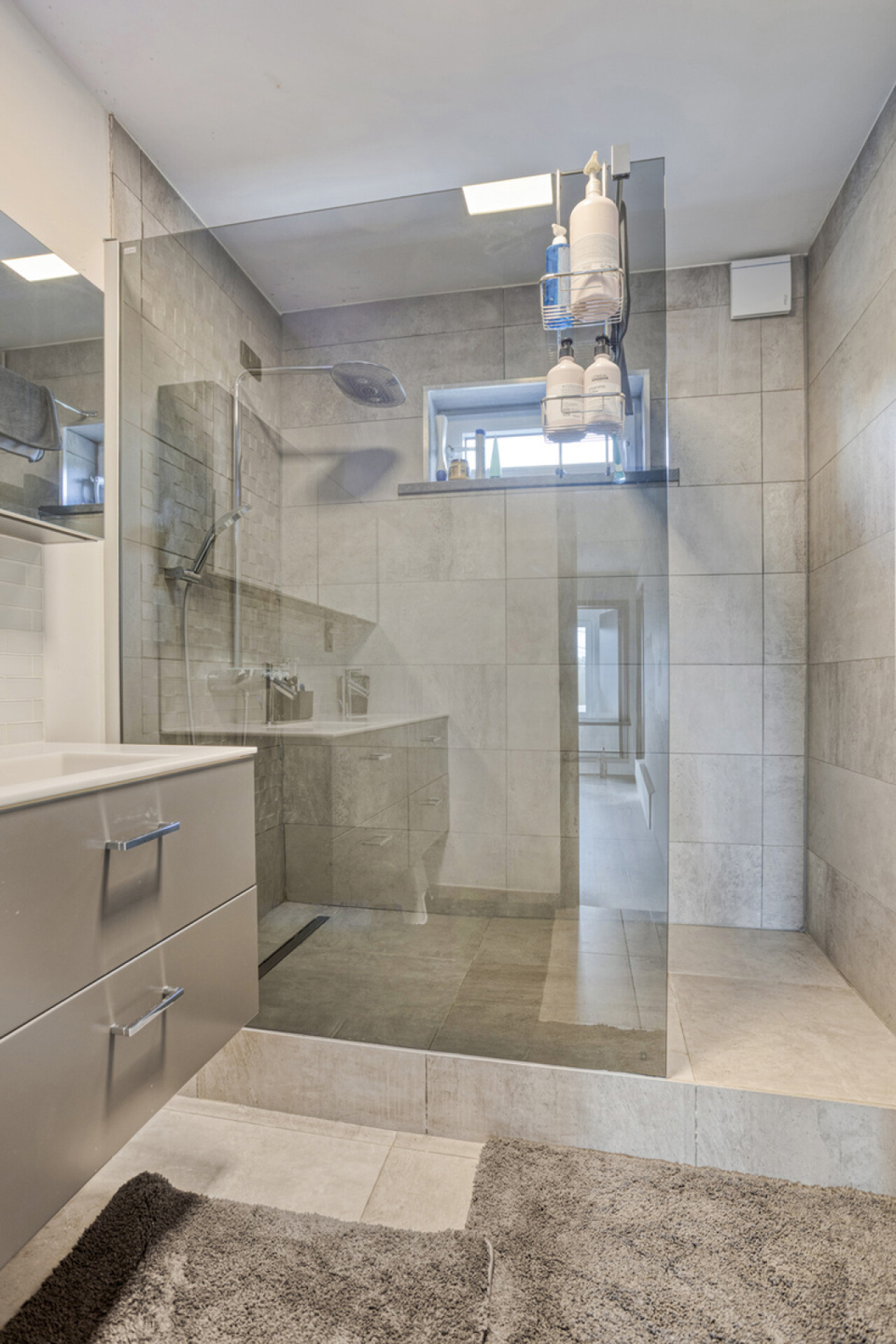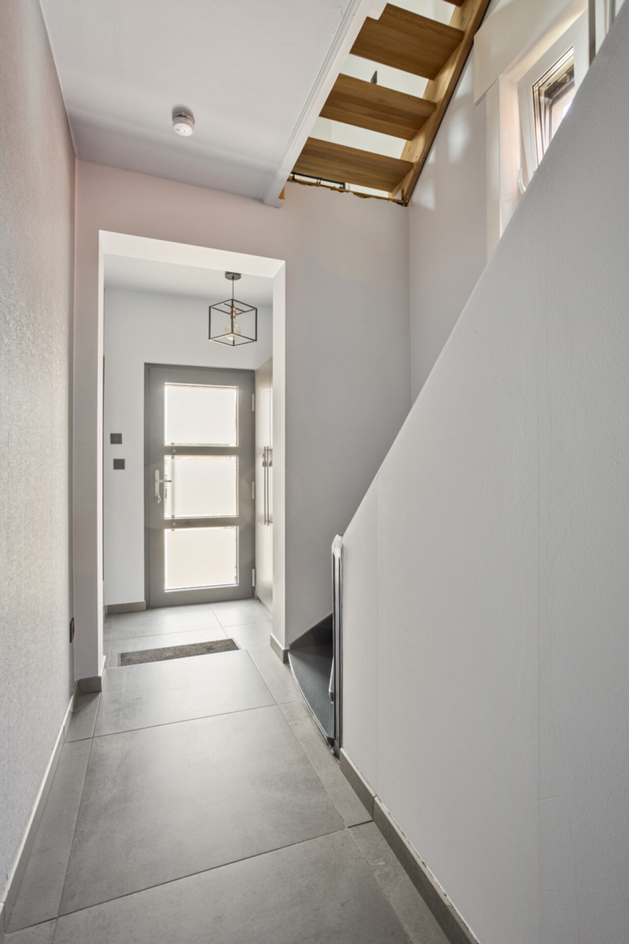 Indeling: Gv: ruime inkomhal met een apart gastentoilet, woonkamer met gashaard en eetplaats, een prachtige open geïnstalleerde keuken, bureau en wasberging/bijkeuken. De gelijkvloerse verdieping werd voorzien van vloerverwarming. Wat meteen opvalt bij het betreden van deze woning is dat het een zeer lichtrijk huis is. De ramen hebben triple glas en tevens elektrische rolluiken.
