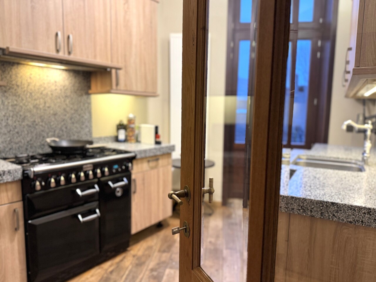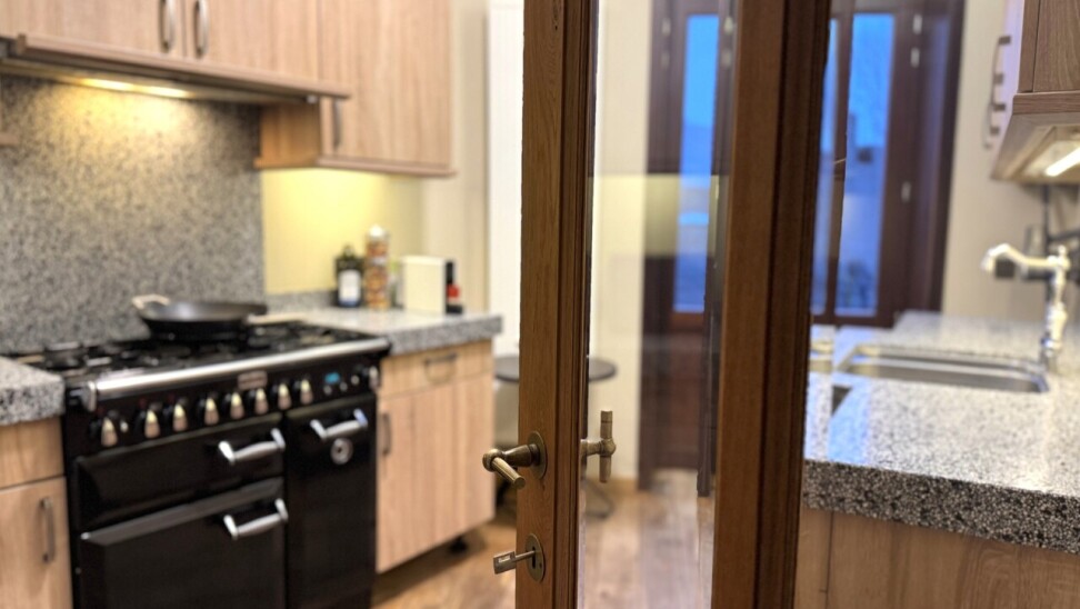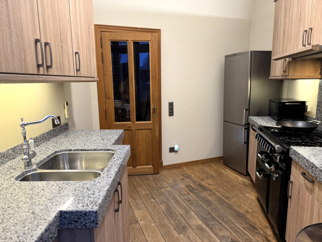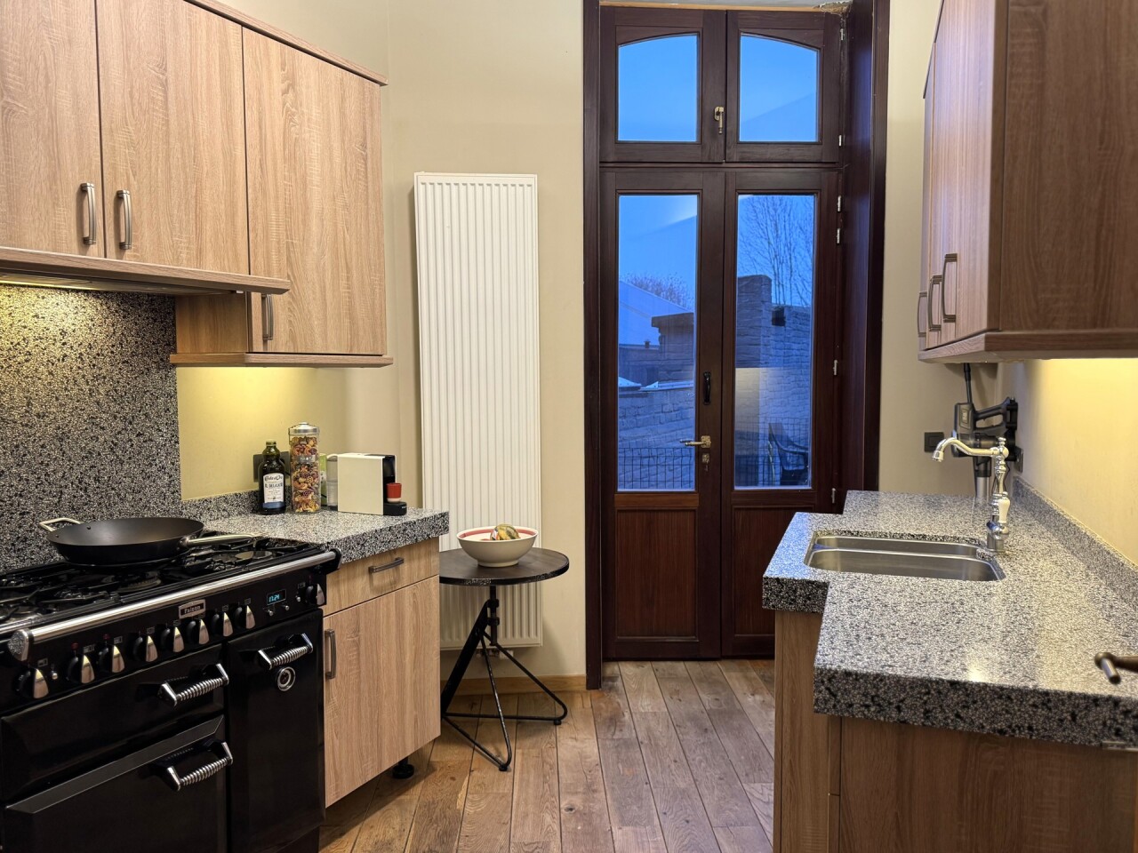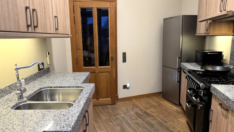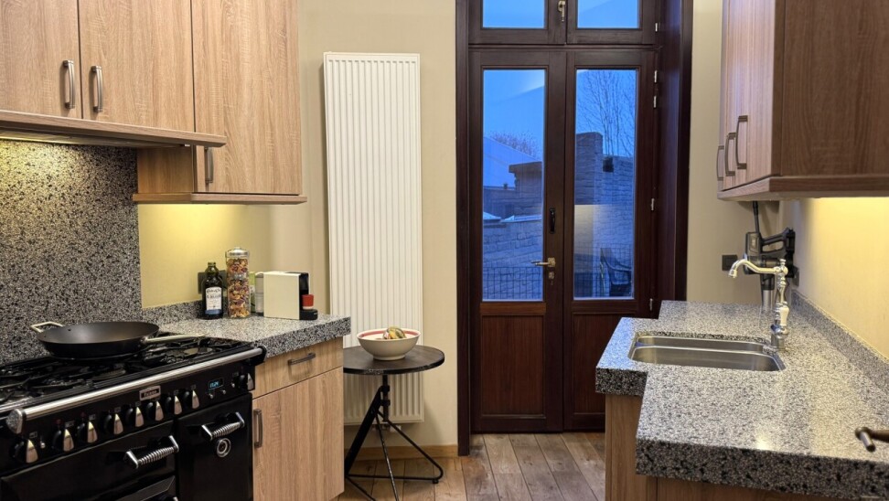 1e verdieping: woonkamer met gashaard, een volledig geïnstalleerde keuken met kwaliteitsvolle toestellen en aansluitend een cosy dakterras