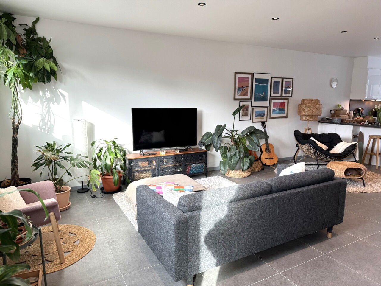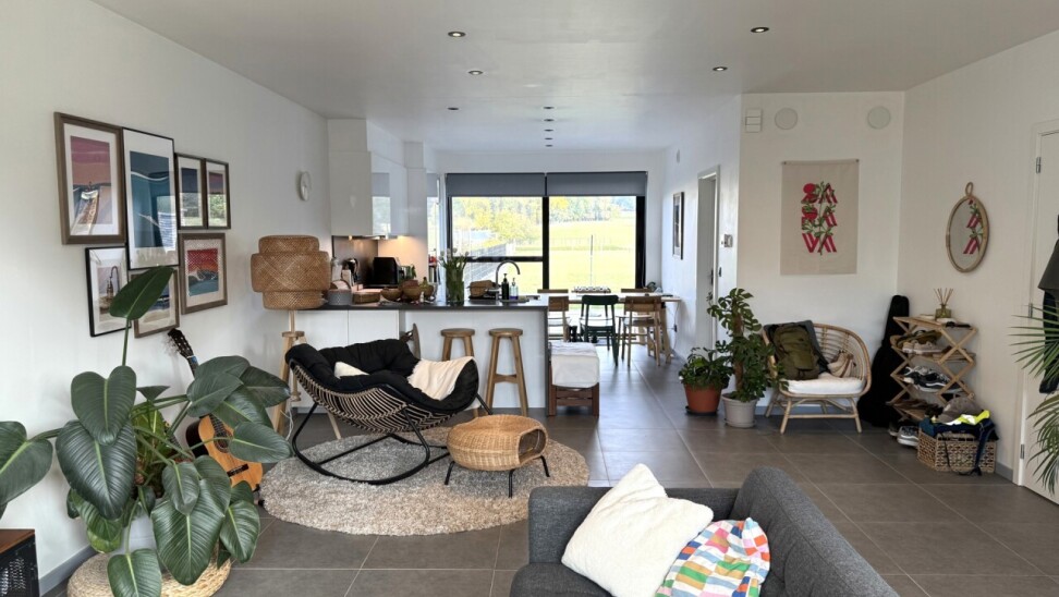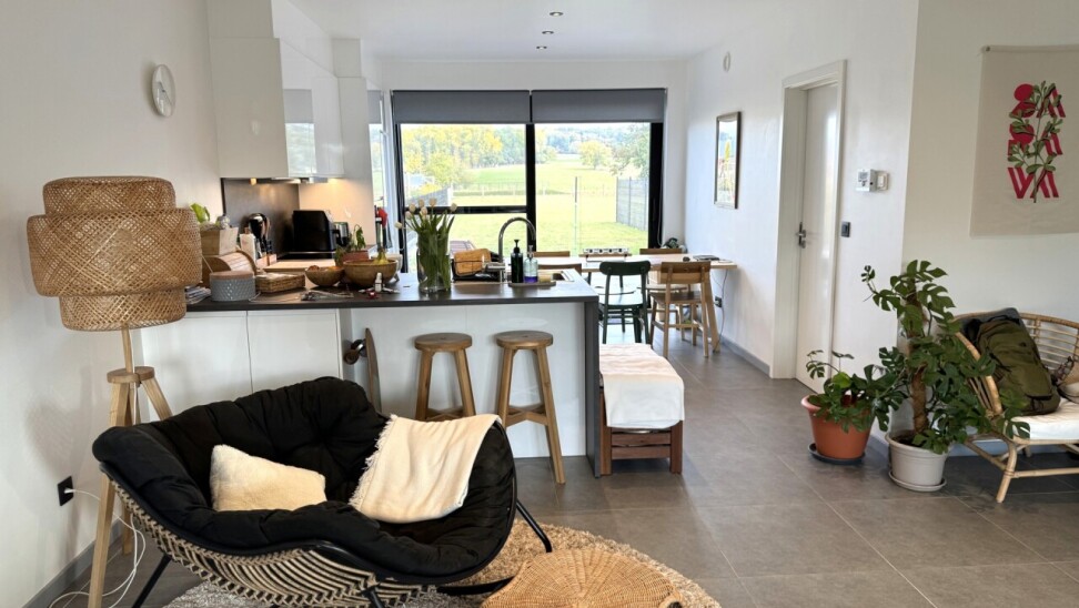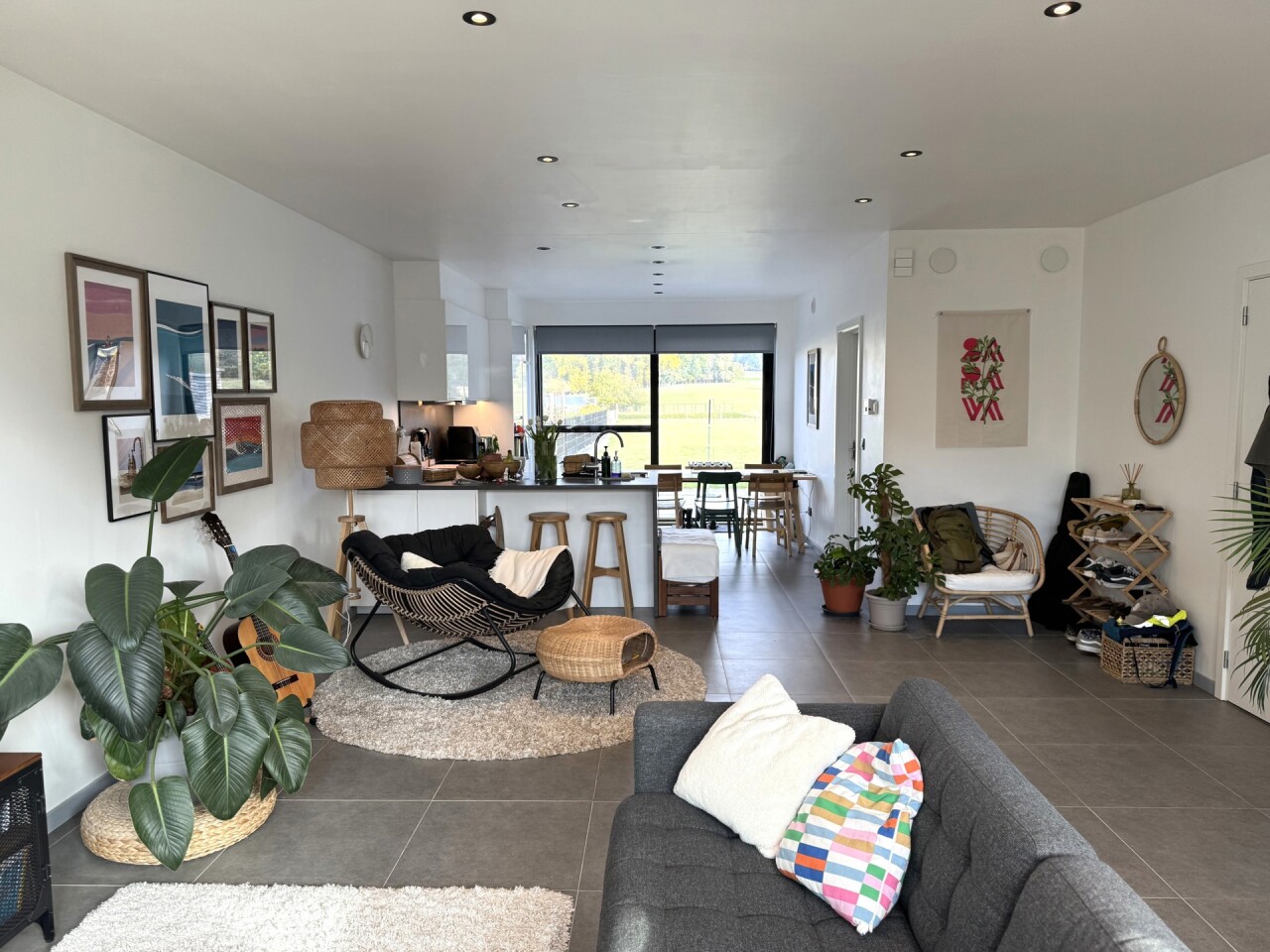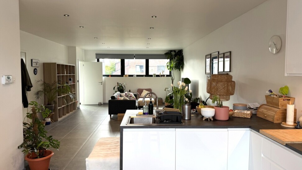 Op de verdieping: woonkamer met open volledig geïnstalleerde keuken, wasberging en apart toilet.