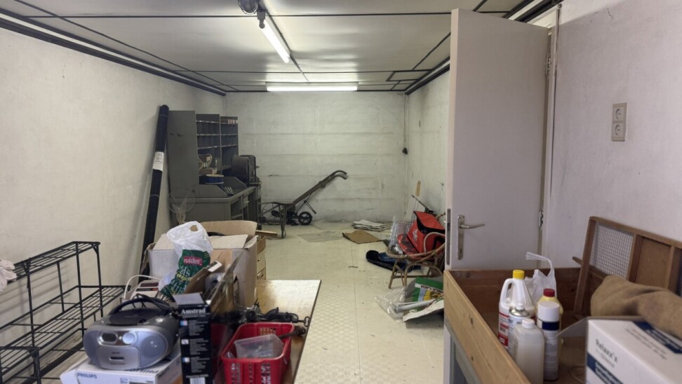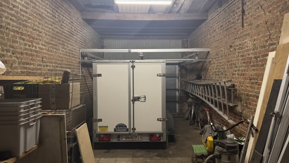 Gelijkvloerse verdieping: inkomhal, apart toilet, leefruimte, keuken en een grote garage/opslagplaats (groene poort links).