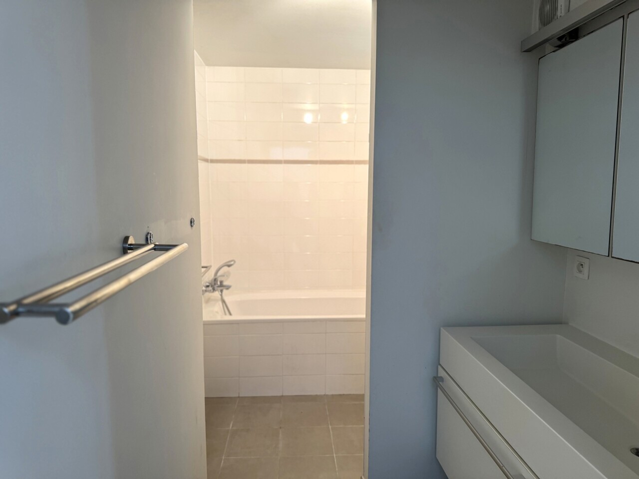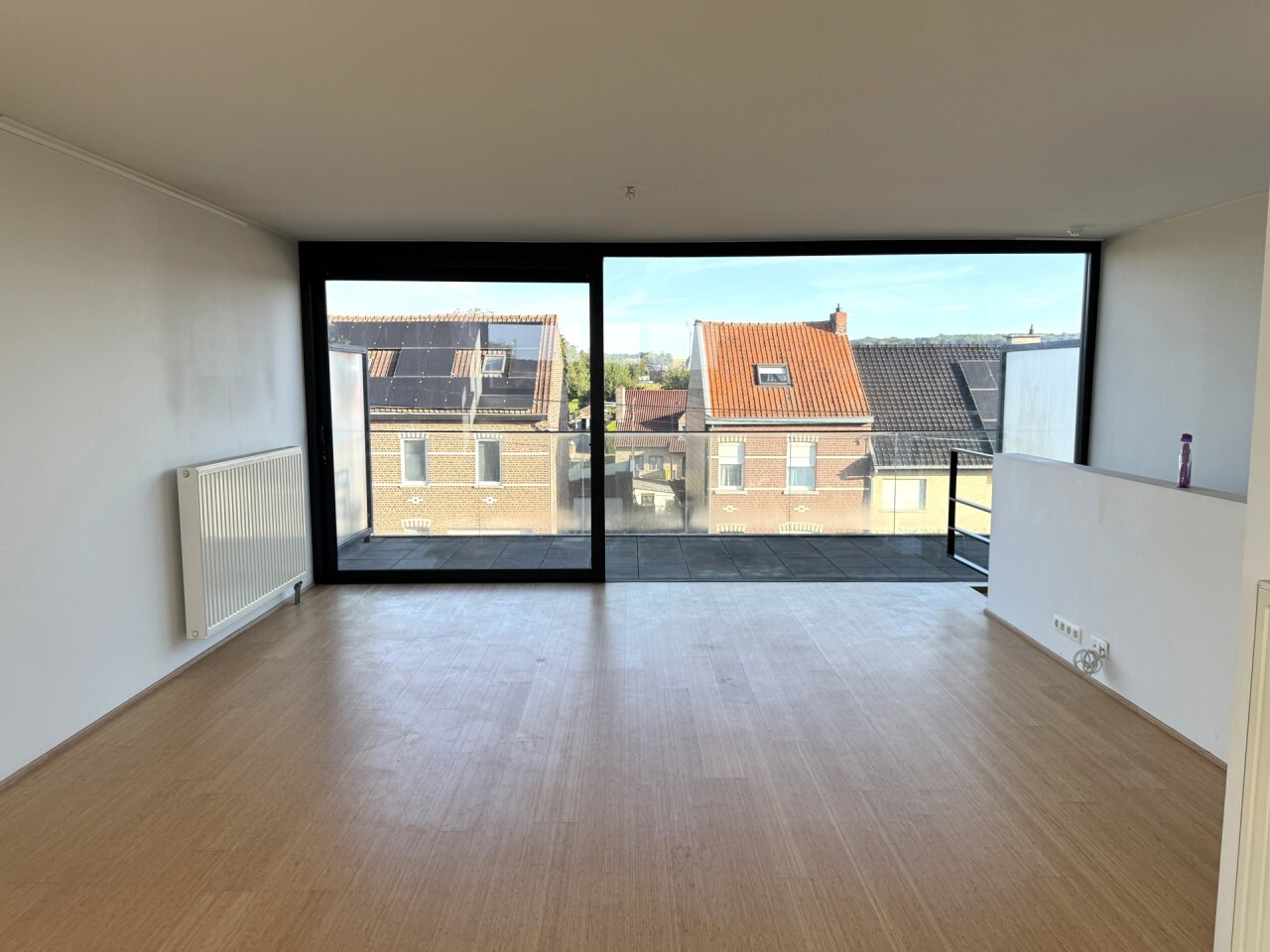 Verdieping: zeer lichtrijke woonkamer met open volledig geïnstalleerde keuken (prachtig uitzicht) met toegang tot een mooi en ruim terras. Tevens open autostaanplaats inbegrepen. De huurprijs bedraagt 1280€/maand en er zijn GEEN gemeenschappelijke lasten. Verbruik individueel