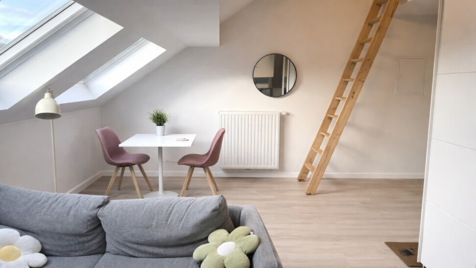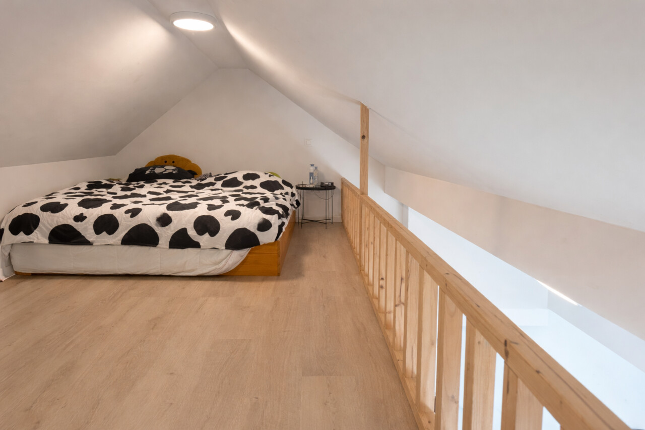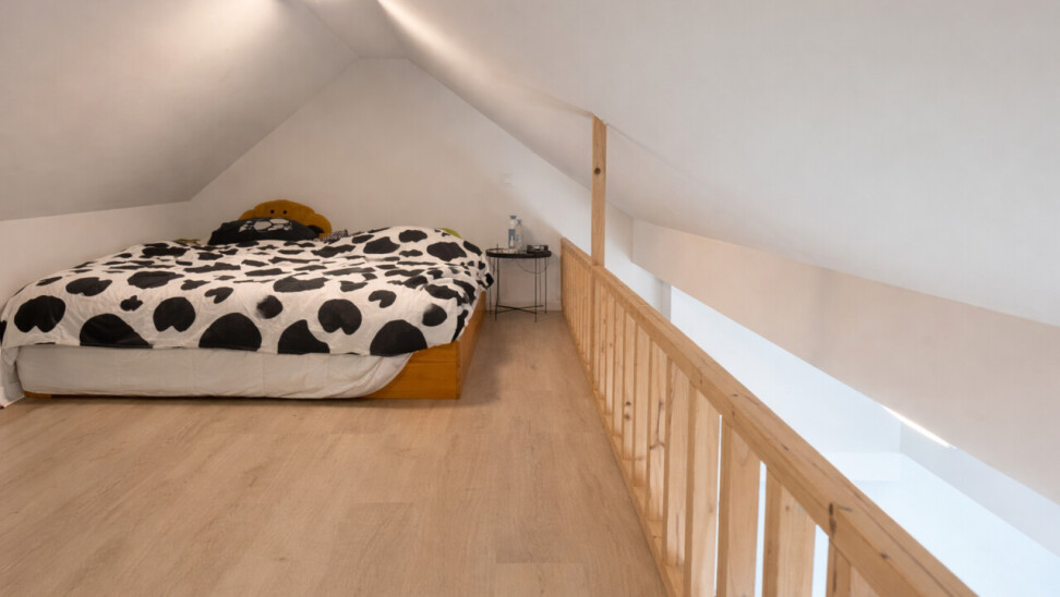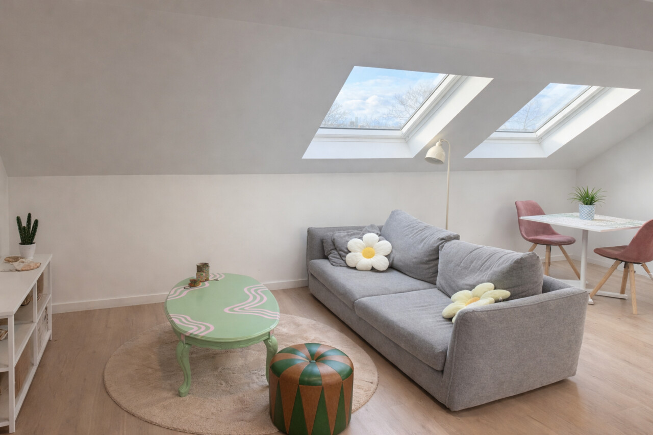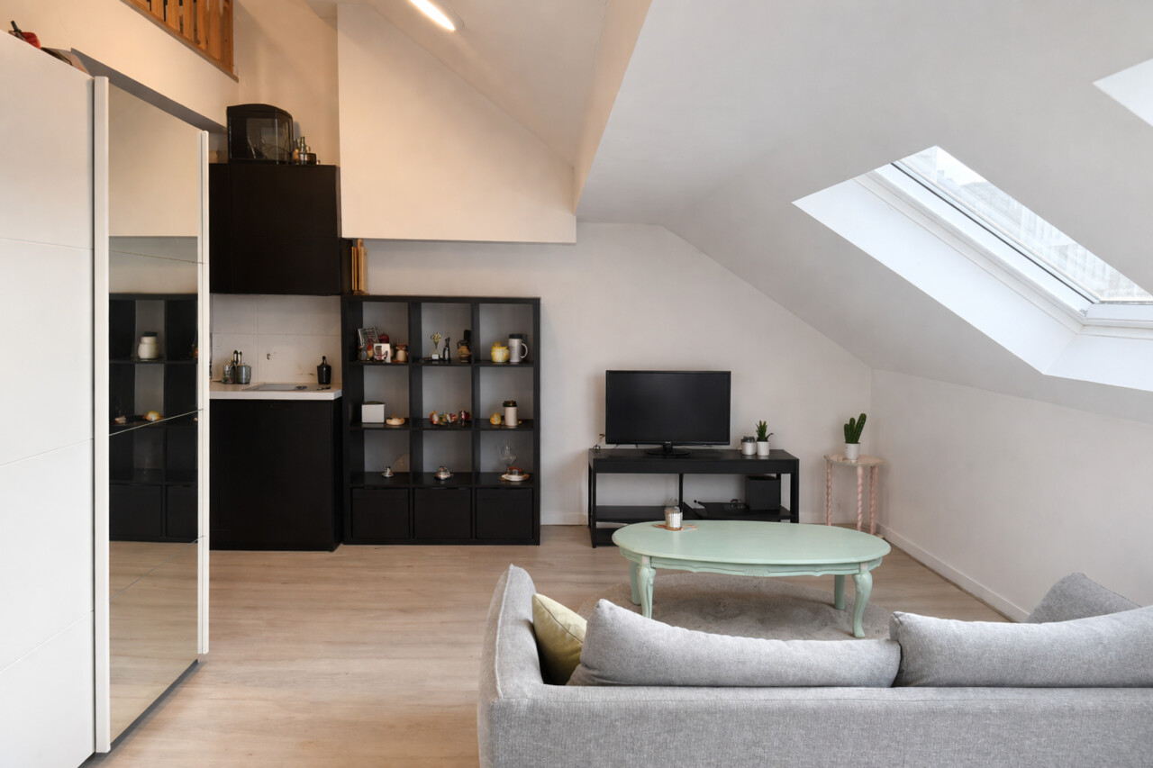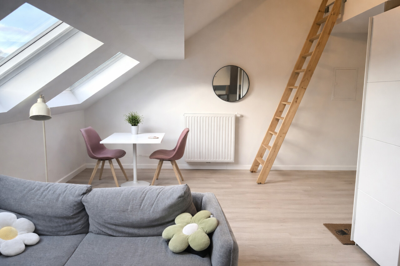 De lichtrijke studio (ca. 33 m²) werd efficiënt ingericht met een mezzanine die fungeert als slaapruimte, waardoor de bruikbare oppervlakte optimaal wordt benut. De open leefruimte met geïntegreerde keuken en bureauhoek speelt perfect in op de huidige huurvraag van studenten en young professionals.