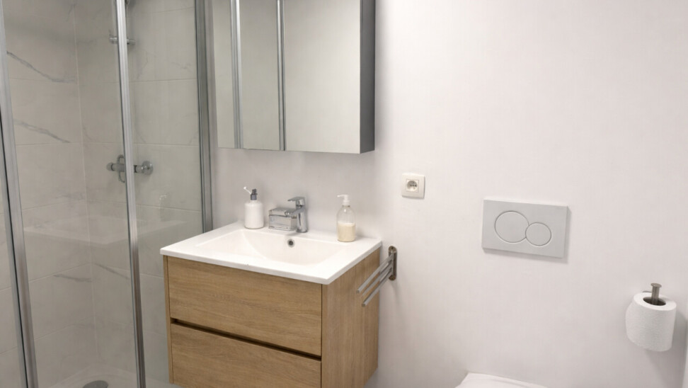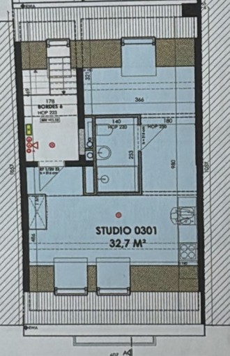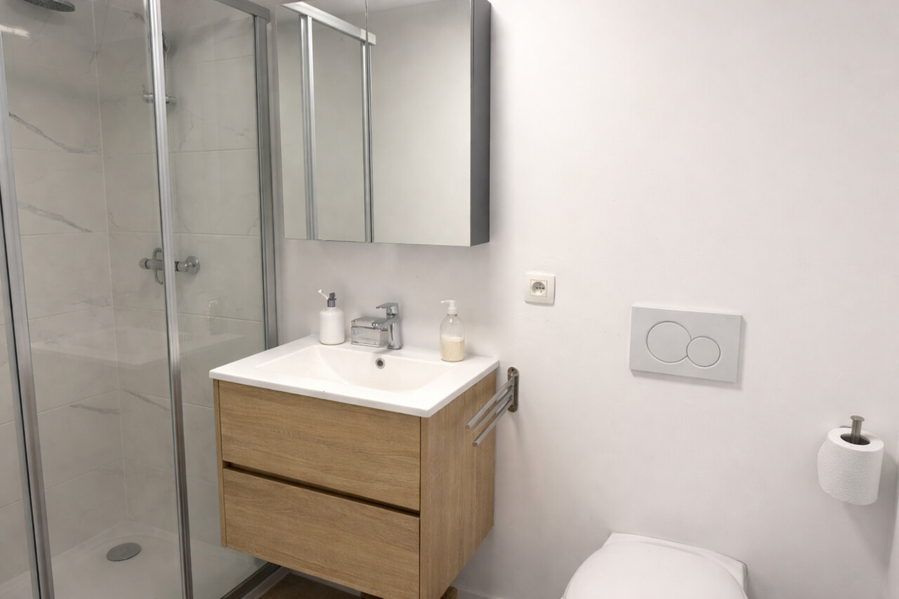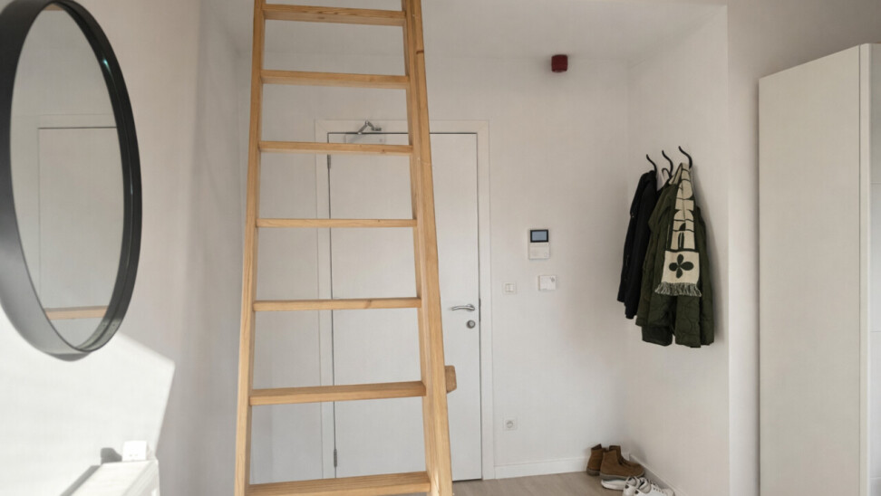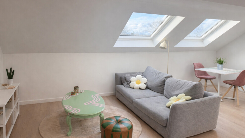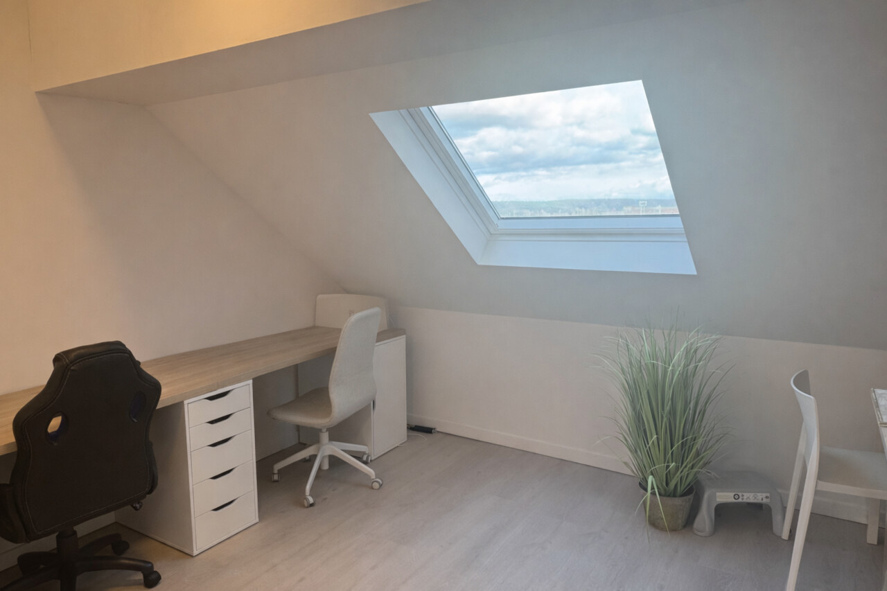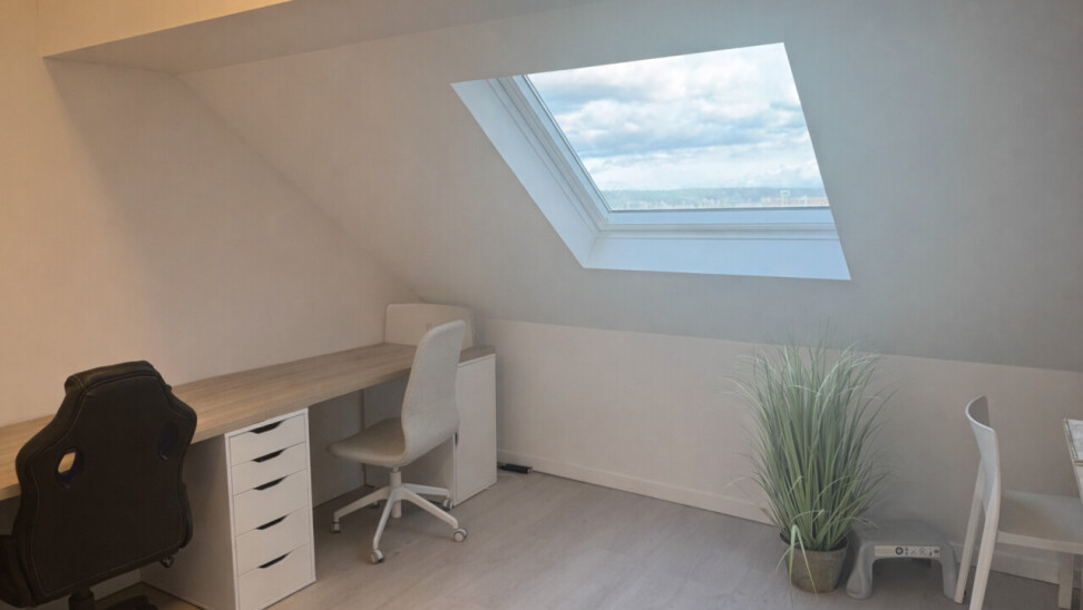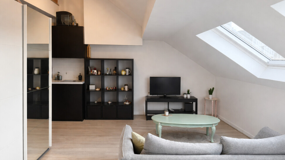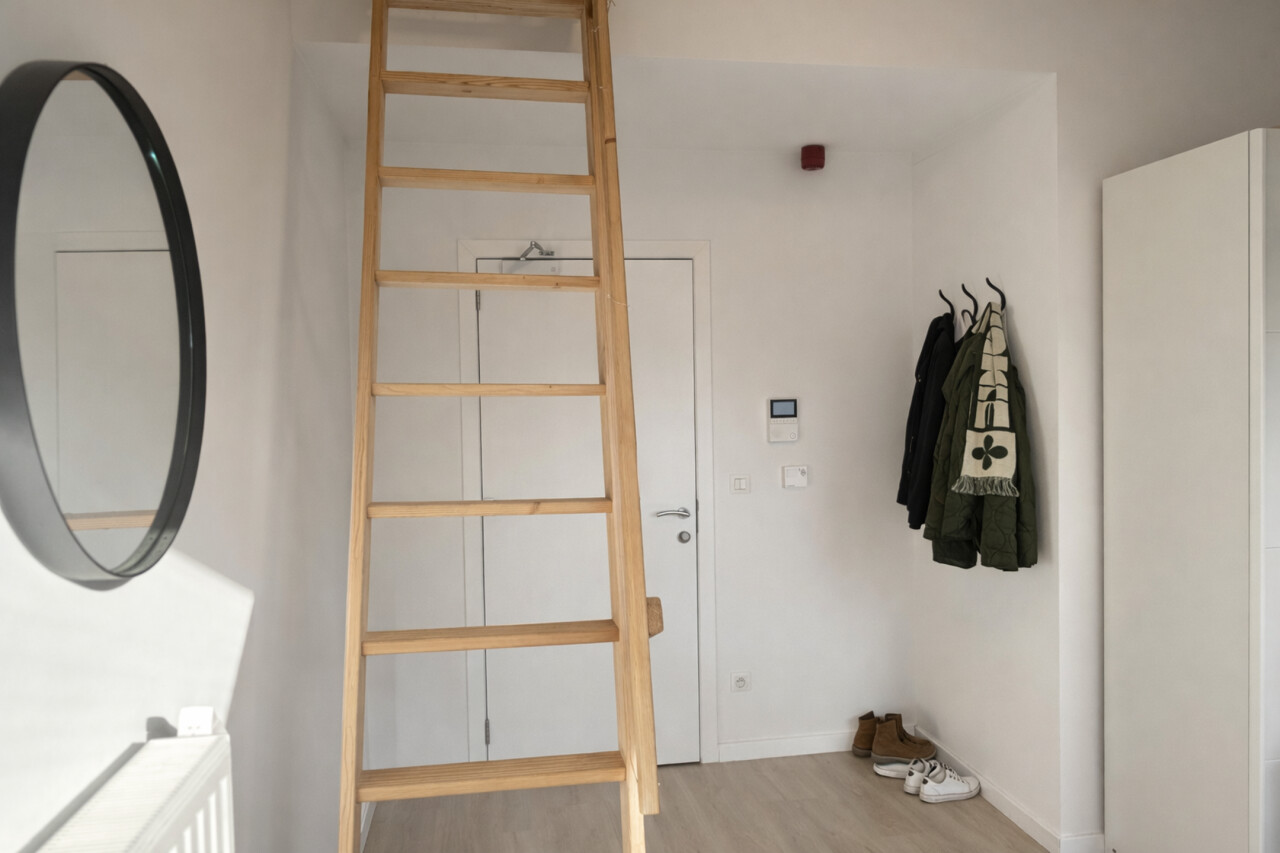 De lichtrijke studio (ca. 33 m²) werd efficiënt ingericht met een mezzanine die fungeert als slaapruimte, waardoor de bruikbare oppervlakte optimaal wordt benut. De open leefruimte met geïntegreerde keuken en bureauhoek speelt perfect in op de huidige huurvraag van studenten en young professionals.