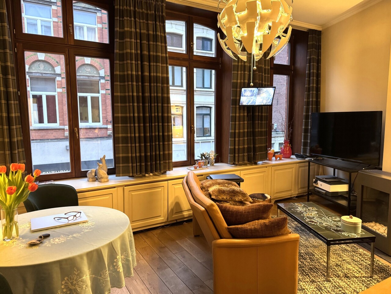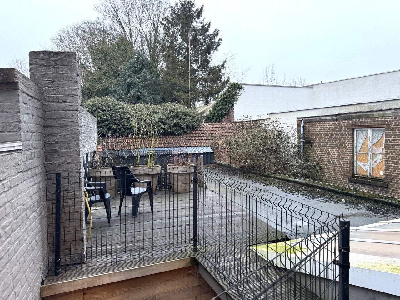 1e verdieping: woonkamer met gashaard, een volledig geïnstalleerde keuken met kwaliteitsvolle toestellen en aansluitend een cosy dakterras