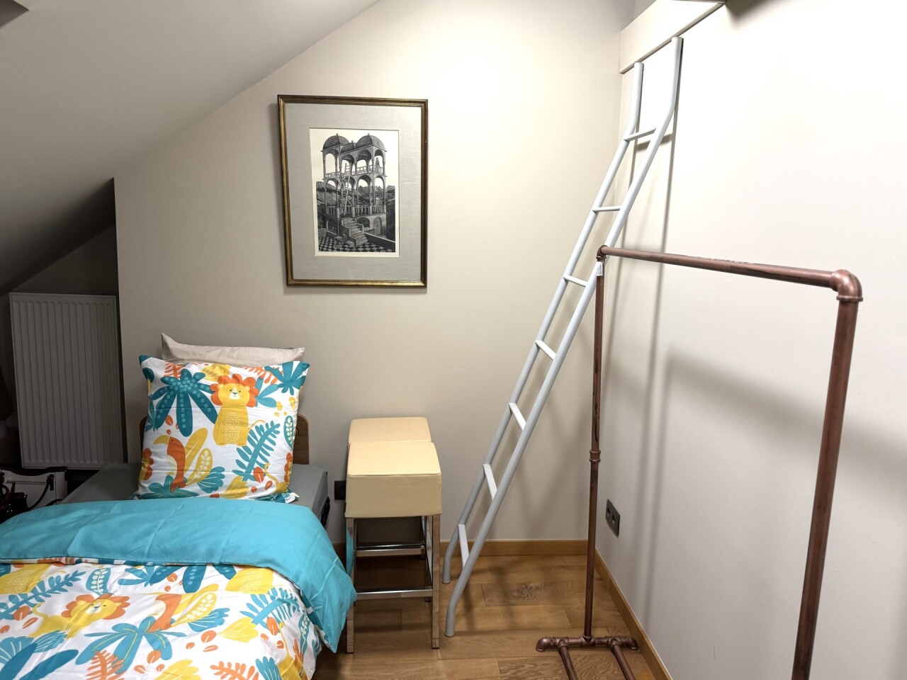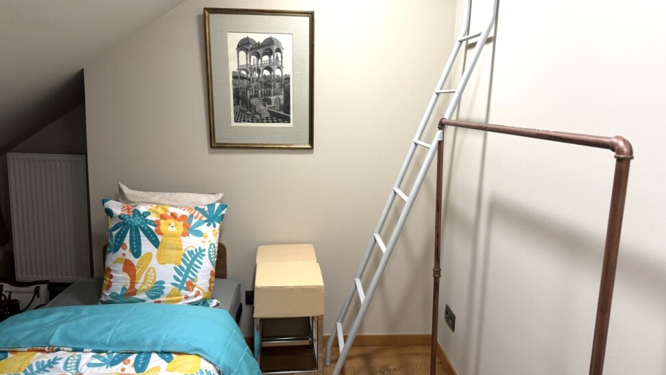 Zolderverdieping: slaapkamer met lavabo en mezzanine.